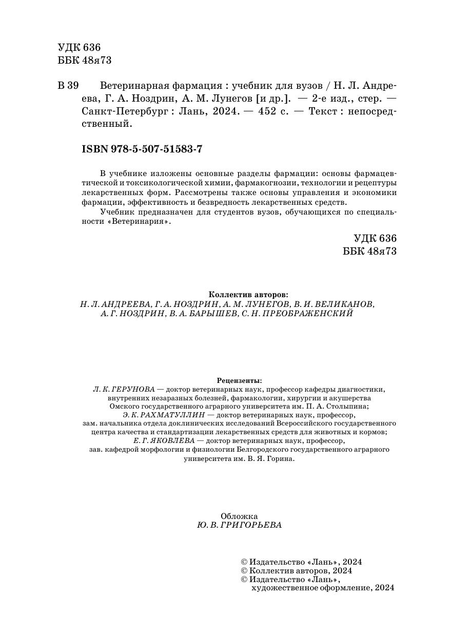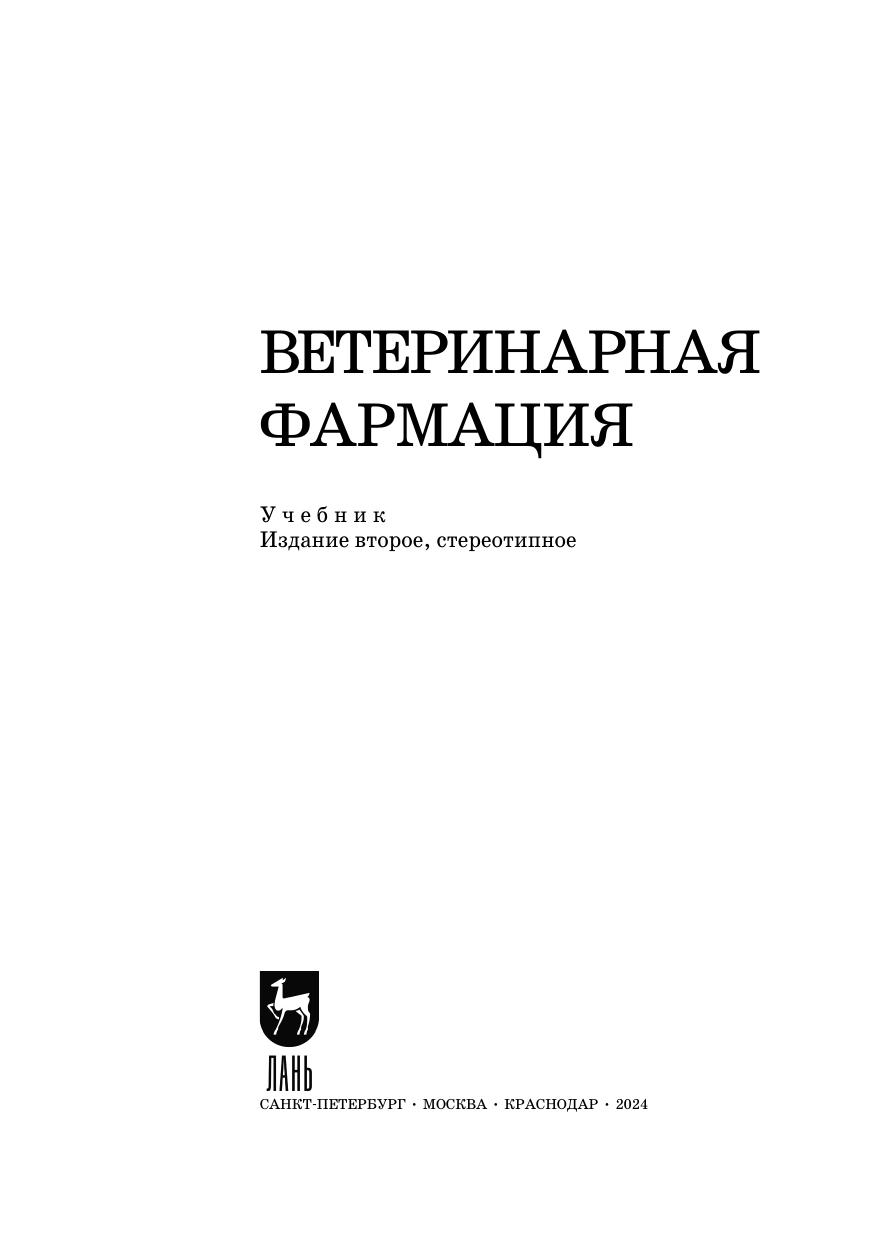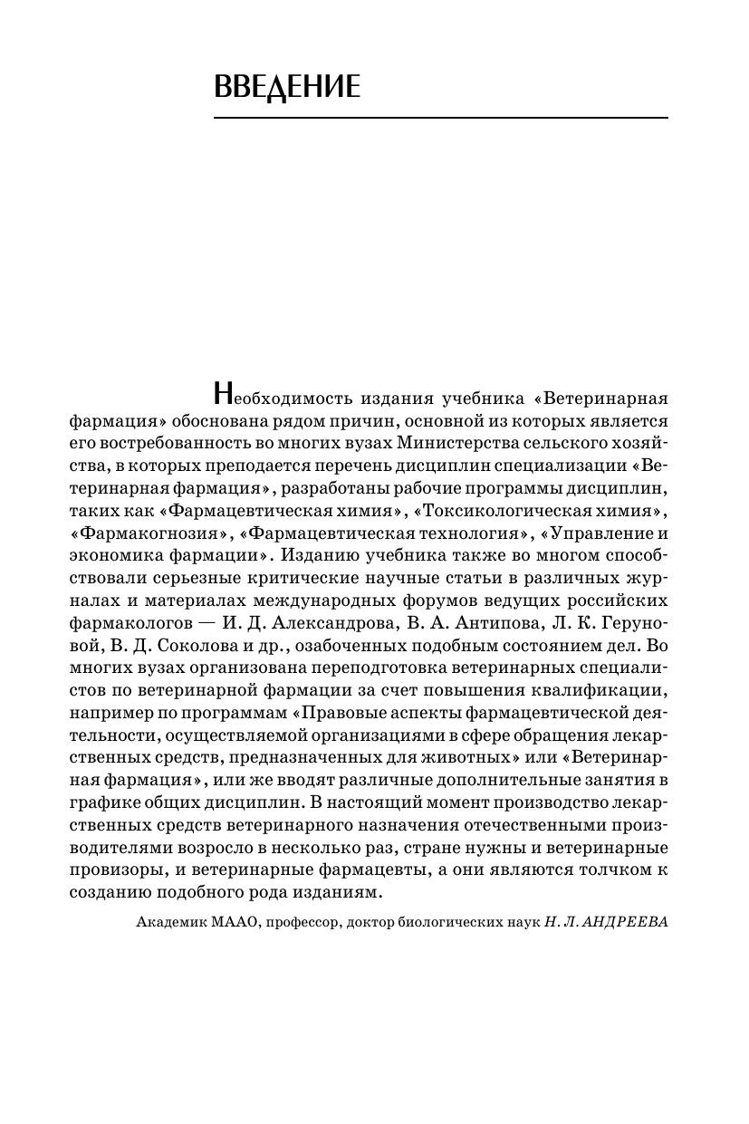 В учебнике изложены основные разделы фармации: основы фармацев-тической и токсикологической химии, фармакогнозии, технологии и рецептуры лекарственных форм. Рассмотрены также основы управления и экономики фармации, эффективность и безвредность лекарственных средств. Учебник предназначен для студентов, обучающихся по специальности «Ветеринария».