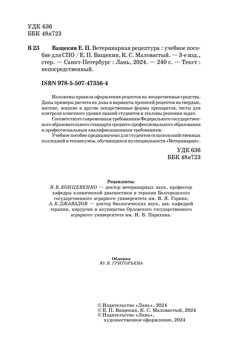 Изложены правила оформления рецептов на лекарственные средства. Даны примеры расчета их дозы и варианты прописей рецептов на твердые, мягкие, жидкие и другие лекарственные формы препаратов, тесты для контроля конечного уровня знаний студентов и эталоны решения задач. Соответствует современным требованиям Федерального государственного образовательного стандарта среднего профессионального образования и профессиональным квалификационным требованиям. Учебное пособие предназначено для студентов сельскохозяйственных колледжей и техникумов, обучающихся по специальности «Ветеринария».