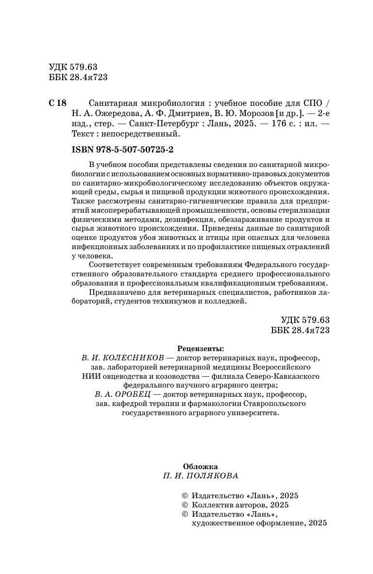 В учебном пособии представлены сведения по санитарной микробиологии с использованием основных нормативно-правовых документов по санитарно-микробиологическому исследованию объектов окружающей среды, сырья и пищевой продукции животного происхождения. Также рассмотрены санитарно-гигиенические правила для предприятий мясоперерабатывающей промышленности, основы стерилизации физическими методами, дезинфекция, обеззараживание продуктов и сырья животного происхождения. Приведены данные по санитарной оценке продуктов убоя животных и птицы при опасных для человека инфекционных заболеваниях и по профилактике пищевых отравлений у человека. Соответствует современным требованиям Федерального государственного образовательного стандарта среднего профессионального образования и профессиональным квалификационным требованиям. Предназначено для ветеринарных специалистов, работников лабораторий, студентов техникумов и колледжей.