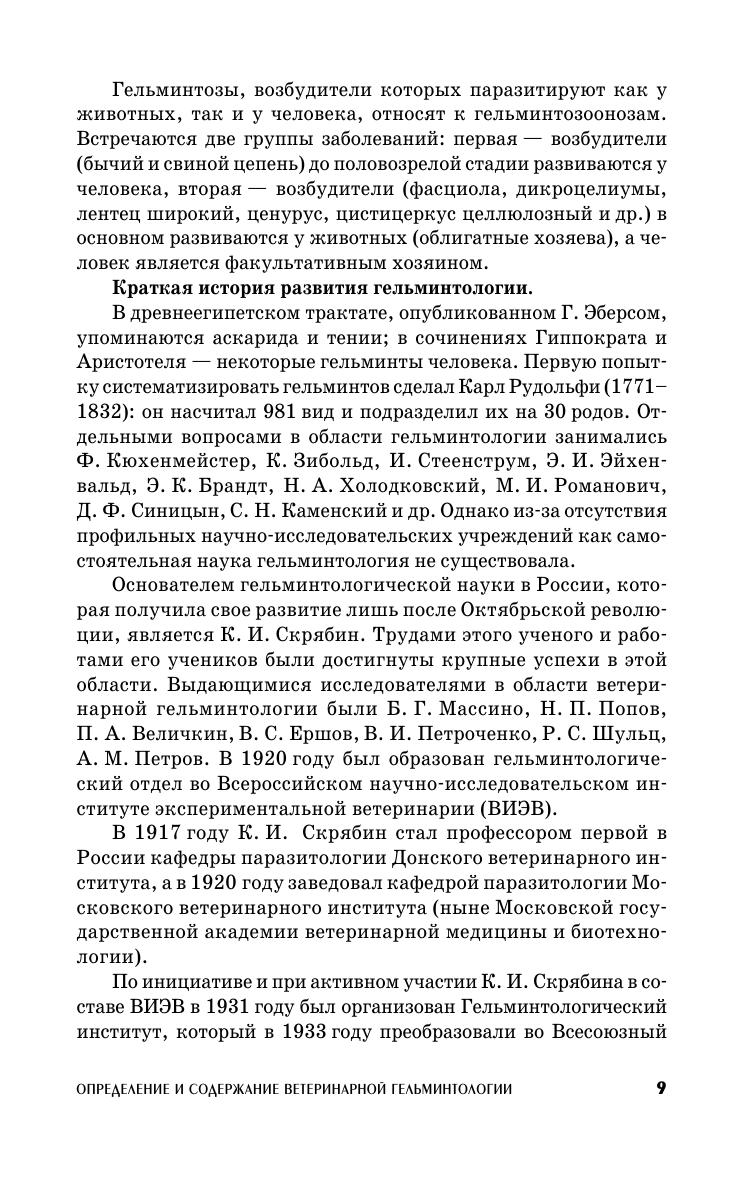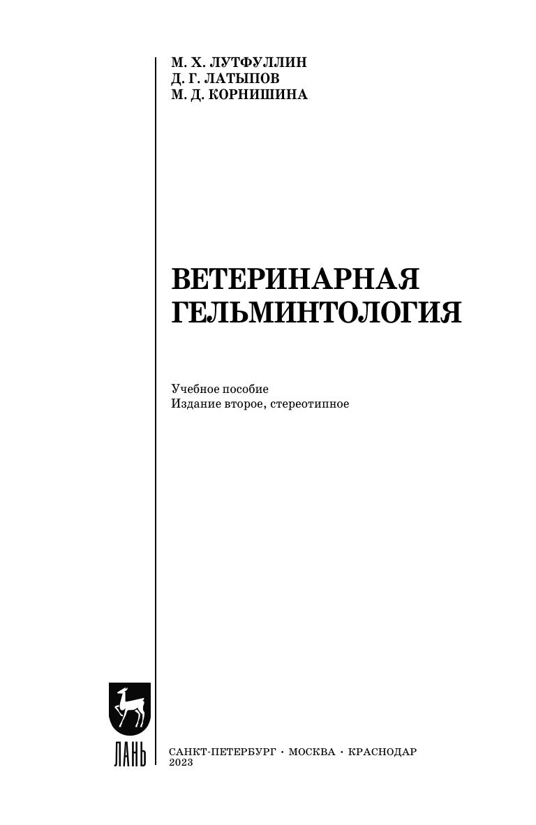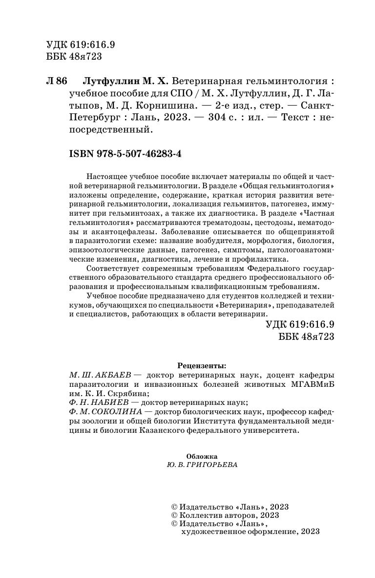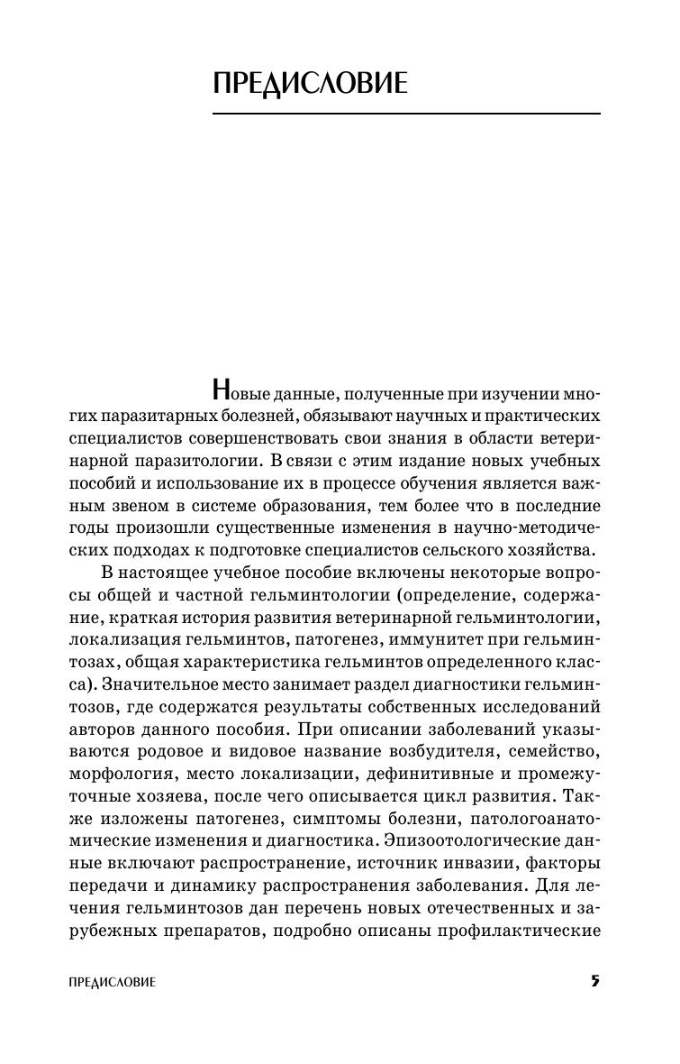 Настоящее учебное пособие включает материалы по общей и частной ветеринарной гельминтологии. В разделе Общая гельминтология изложены определение, содержание, краткая история развития ветеринарной гельминтологии, локализация гельминтов, патогенез, иммунитет при гельминтозах, а также их диагностика. В разделе Частная гельминтология рассматриваются трематодозы, цестодозы, нематодозы и акантоцефалезы. Заболевание описывается по общепринятой в паразитологии схеме: название возбудителя, морфология, биология, эпизоотологические данные, патогенез, симптомы, патологоанатомические изменения, диагностика, лечение и профилактика. Соответствует современным требованиям Федерального государственного образовательного стандарта среднего профессионального образования и профессиональным квалификационным требованиям. Учебное пособие предназначено для студентов колледжей и техникумов, обучающихся по специальности Ветеринария, преподавателей и специалистов, работающих в области ветеринарии.