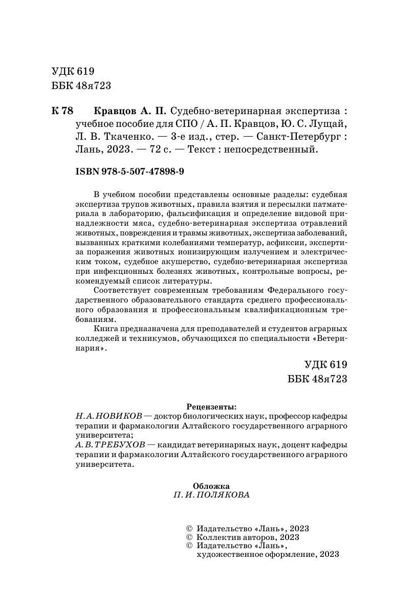 В учебном пособии представлены основные разделы: судебная экспертиза трупов животных, правила взятия и пересылки патматериала в лабораторию, фальсификация и определение видовой принадлежности мяса, судебно-ветеринарная экспертиза отравлений животных, повреждения и травмы животных, экспертиза заболеваний, вызванных краткими колебаниями температур, асфиксии, экспертиза поражения животных ионизирующим излучением и электрическим током, судебное акушерство, судебно-ветеринарная экспертиза при инфекционных болезнях животных, контрольные вопросы, рекомендуемый список литературы. Соответствует современным требованиям Федерального государственного образовательного стандарта среднего профессионального образования и профессиональным квалификационным требованиям. Книга предназначена для преподавателей и студентов аграрных колледжей и техникумов, обучающихся по специальности «Ветеринария».