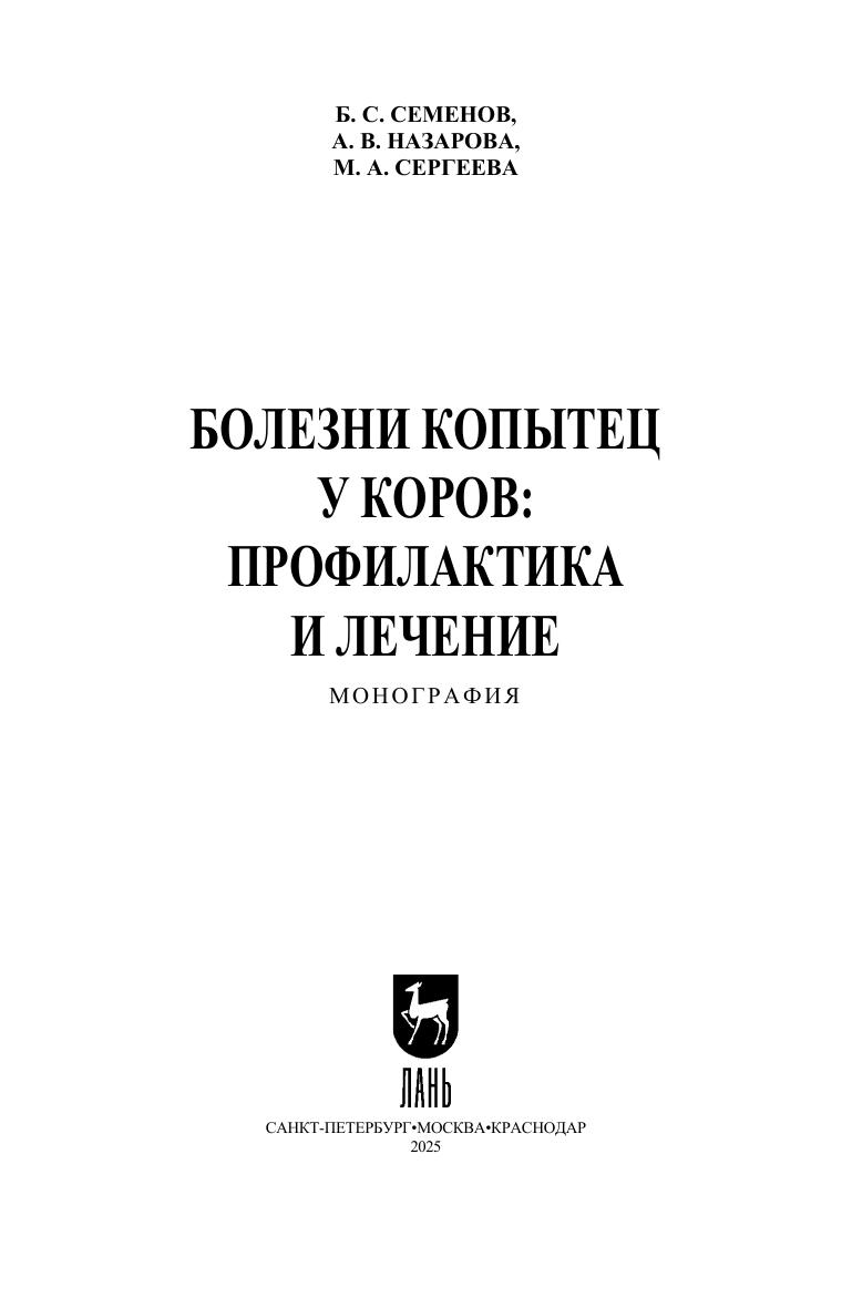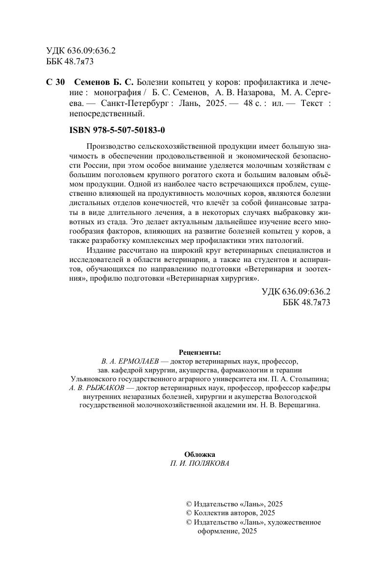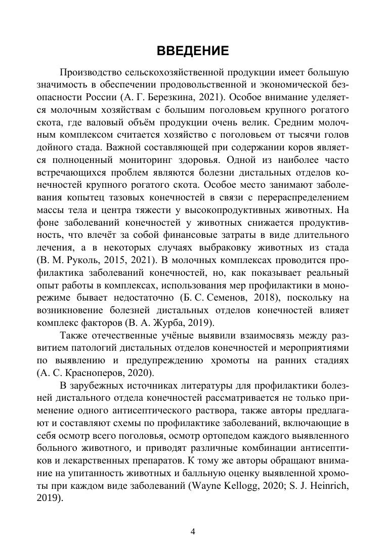 Производство сельскохозяйственной продукции имеет большую значимость в обеспечении продовольственной и экономической безопасности России, при этом особое внимание уделяется молочным хозяйствам с большим поголовьем крупного рогатого скота и большим валовым объёмом продукции. Одной из наиболее часто встречающихся проблем, существенно влияющей на продуктивность молочных коров, являются болезни дистальных отделов конечностей, что влечёт за собой финансовые затраты в виде длительного лечения, а в некоторых случаях выбраковку животных из стада. Это делает актуальным дальнейшее изучение всего многообразия факторов, влияющих на развитие болезней копытец у коров, а также разработку комплексных мер профилактики этих патологий. Издание рассчитано на широкий круг ветеринарных специалистов и исследователей в области ветеринарии, а также на студентов и аспирантов, обучающихся по направлению подготовки «Ветеринария и зоотехния», профилю подготовки «Ветеринарная хирургия».