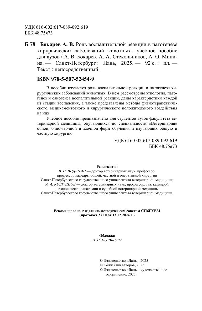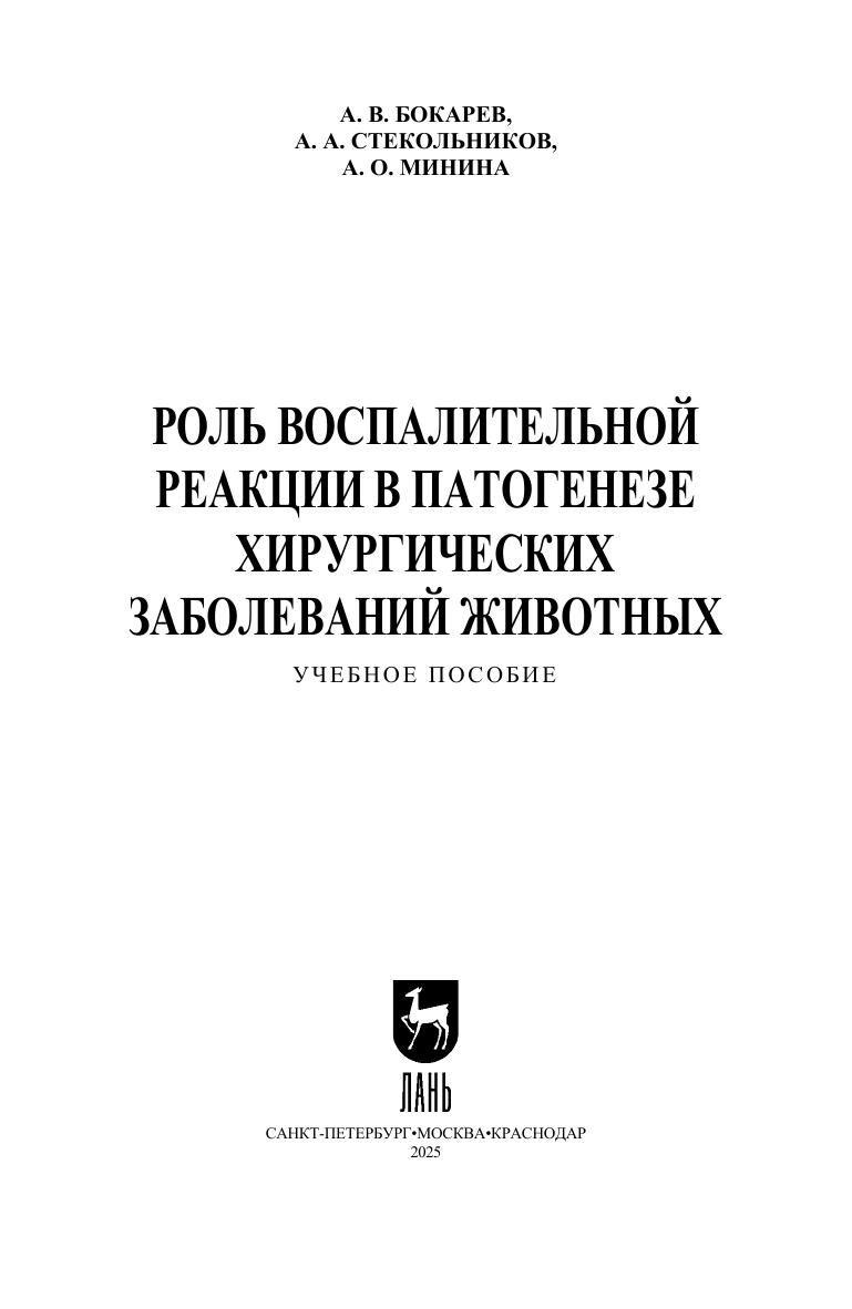 В пособии изучается роль воспалительной реакции в патогенезе хирургических заболеваний животных. В нем рассмотрены этиология, патогенез и саногенез воспалительной реакции, даны характеристики каждой из стадий воспаления, а также представлены методы физиотерапевтического, медикаментозного и хирургического положительного воздействия на них. Учебное пособие предназначено для студентов вузов факультета ветеринарной медицины, обучающихся по специальности «Ветеринария» очной, очно-заочной и заочной форм обучения и изучающих общую и частную хирургию.