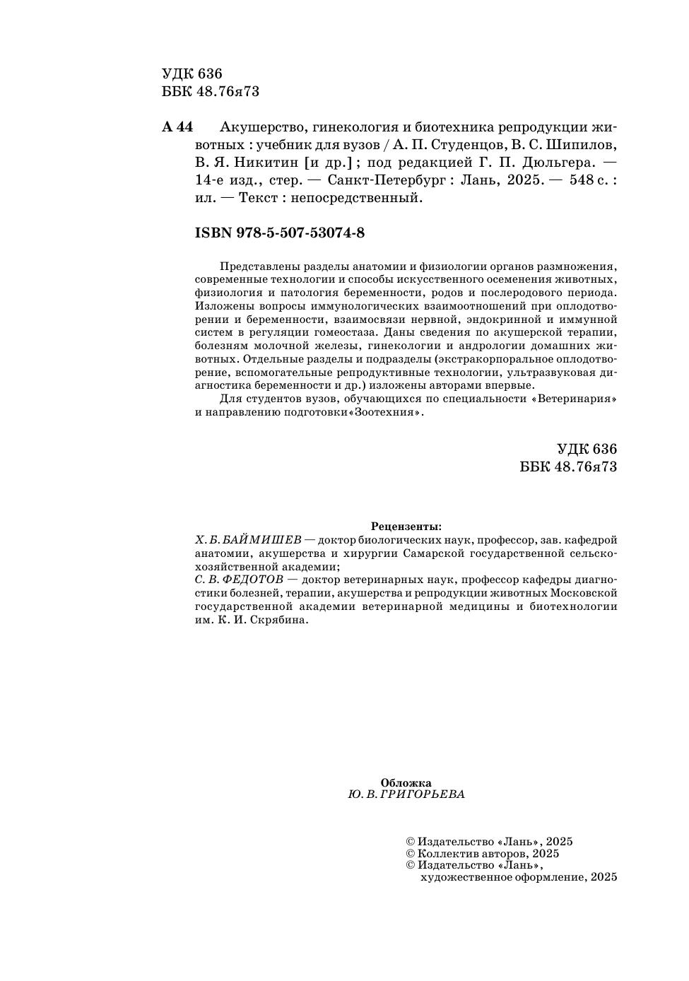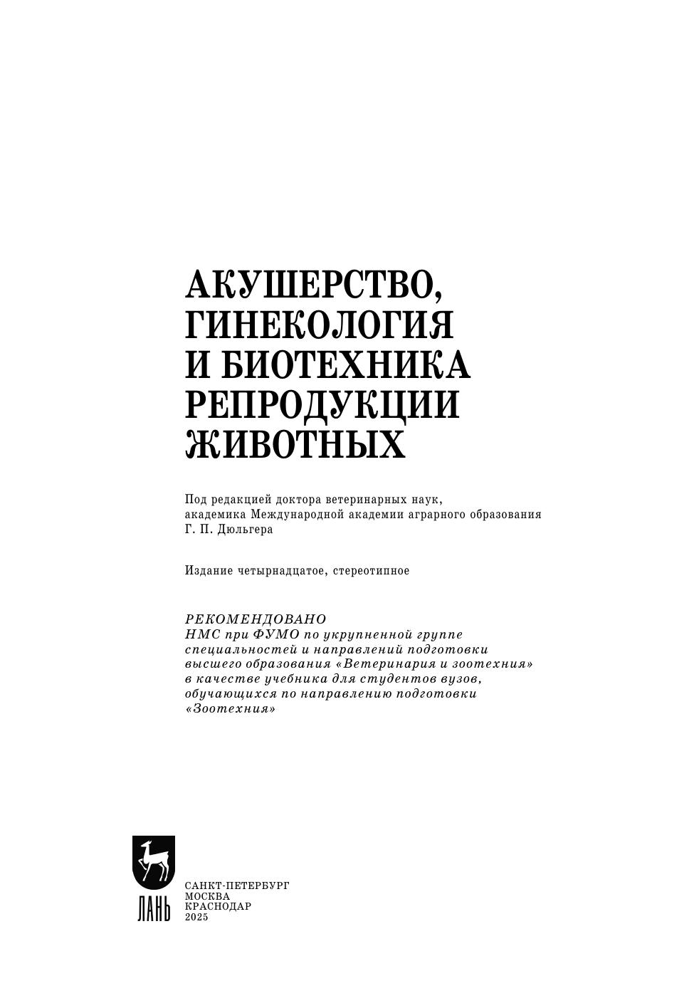 Представлены разделы анатомии и физиологии органов размножения, современные технологии и способы искусственного осеменения животных, физиология и патология беременности, родов и послеродового периода. Изложены вопросы иммунологических взаимоотношений при оплодотворении и беременности, взаимосвязи нервной, эндокринной и иммунной систем в регуляции гомеостаза. Даны сведения по акушерской терапии, болезням молочной железы, гинекологии и андрологии домашних животных. Внесены изменения и дополнения практически во все разделы учебника. При этом отдельные его разделы и подразделы (экстракорпоральное оплодотворение, вспомогательные репродуктивные технологии, ультразвуковая диагностика беременности и др.) изложены впервые. Для студентов вузов, обучающихся по специальностям «Ветеринария» и направлению подготовки «Зоотехния».