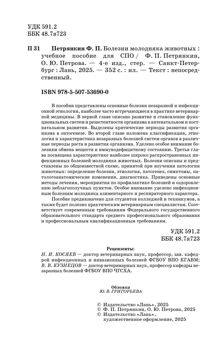 В пособии представлены основные болезни незаразной и инфекционной этиологии, наиболее часто встречающиеся в практике ветеринарной медицины. В первой главе описано развитие и становление функциональных систем и резистентности организма в антенатальном и пост-натальном развитии. Выделены критические периоды развития организма в онтогенезе. Во второй главе изложена классификация, этио-логия и характеристика незаразных болезней систем органов в различные периоды роста и развития организма. Уделено особое внимание болезням обмена веществ и иммунодефицитному состоянию. Третья глава посвящена характеристике наиболее широко распространенных инфекционных болезней молодняка животных. Болезни описаны и представлены по общеизвестной схеме, принятой при изучении патологии животных: определение болезни, этиология, патогенез, симптомы, патологоанатомические изменения, диагностика. Приведены основные методы лечения, мероприятия по профилактике болезней и оздоровлению неблагополучных пунктов. Особое внимание уделено инфекционным болезням молодняка алиментарного и респираторного характера. Пособие предназначено для студентов колледжей и техникумов, а также будет полезно практическим ветеринарным специалистам. Соответствует современным требованиям Федерального государственного образовательного стандарта среднего профессионального образования и профессиональным квалификационным требованиям.
