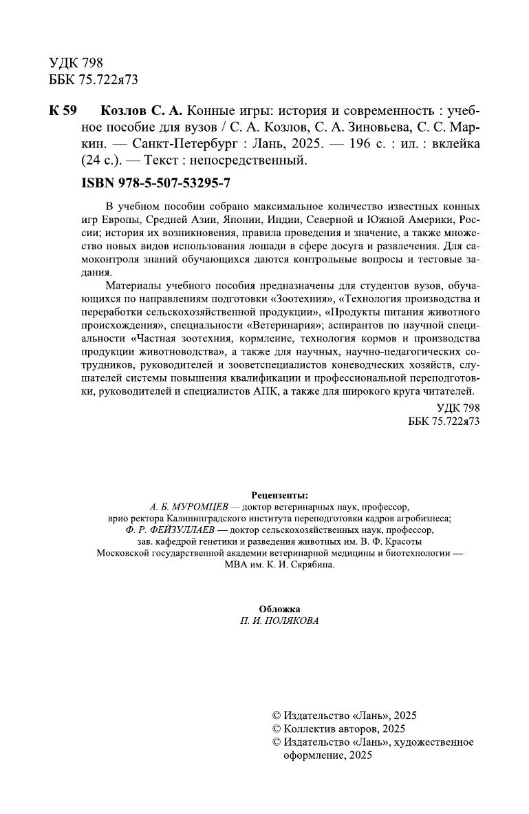 В учебном пособии собрано максимальное количество известных конных игр Европы, Средней Азии, Японии, Индии, Северной и Южной Америки, России, история их возникновения, правила проведения и значение, а также множество новых видов использования лошади в сфере досуга и развлечения. Для самоконтроля знаний обучающихся даются контрольные вопросы и тестовые задания. Материалы учебного пособия предназначены для студентов вузов, обучающихся по направлениям подготовки «Зоотехния», «Технология производства и переработки сельскохозяйственной продукции», «Продукты питания животного происхождения», специальности «Ветеринария», аспирантов по научной специальности «Частная зоотехния, кормление, технология кормов и производства продукции животноводства», а также для научных, научно-педагогических сотрудников, руководителей и зооветспециалистов коневодческих хозяйств, слушателей системы повышения квалификации и профессиональной переподготовки, руководителей и специалистов АПК, а также для широкого круга читателей.