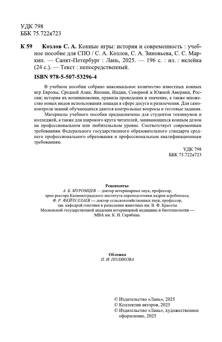 В учебном пособии собрано максимальное количество известных конных игр Европы, Средней Азии, Японии, Индии, Северной и Южной Америки, России, история их возникновения, правила проведения и значение, а также множество новых видов использования лошади в сфере досуга и развлечения. Для самоконтроля знаний обучающихся даются контрольные вопросы и тестовые задания. Материалы учебного пособия предназначены для студентов техникумов и колледжей, а также для широкого круга читателей, занимающихся конным делом на профессиональном или любительском уровне. Соответствует современным требованиям Федерального государственного образовательного стандарта среднего профессионального образования и профессиональным квалификационным требованиям.