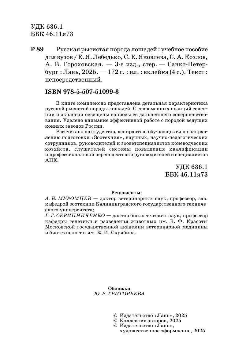 В книге комплексно представлена детальная характеристика русской рысистой породы лошадей. С современных позиций селекции и экологии освещены вопросы ее дальнейшего совершенствования. Уделено внимание эффективной работе с породой ведущих конных заводов России. Рассчитано на студентов, аспирантов, обучающимся по направлению подготовки «Зоотехния», научных, научно-педагогических сотрудников, руководителей и зооветспециалистов коневодческих хозяйств, слушателей системы повышения квалификации и профессиональной переподготовки руководителей и специалистов АПК.