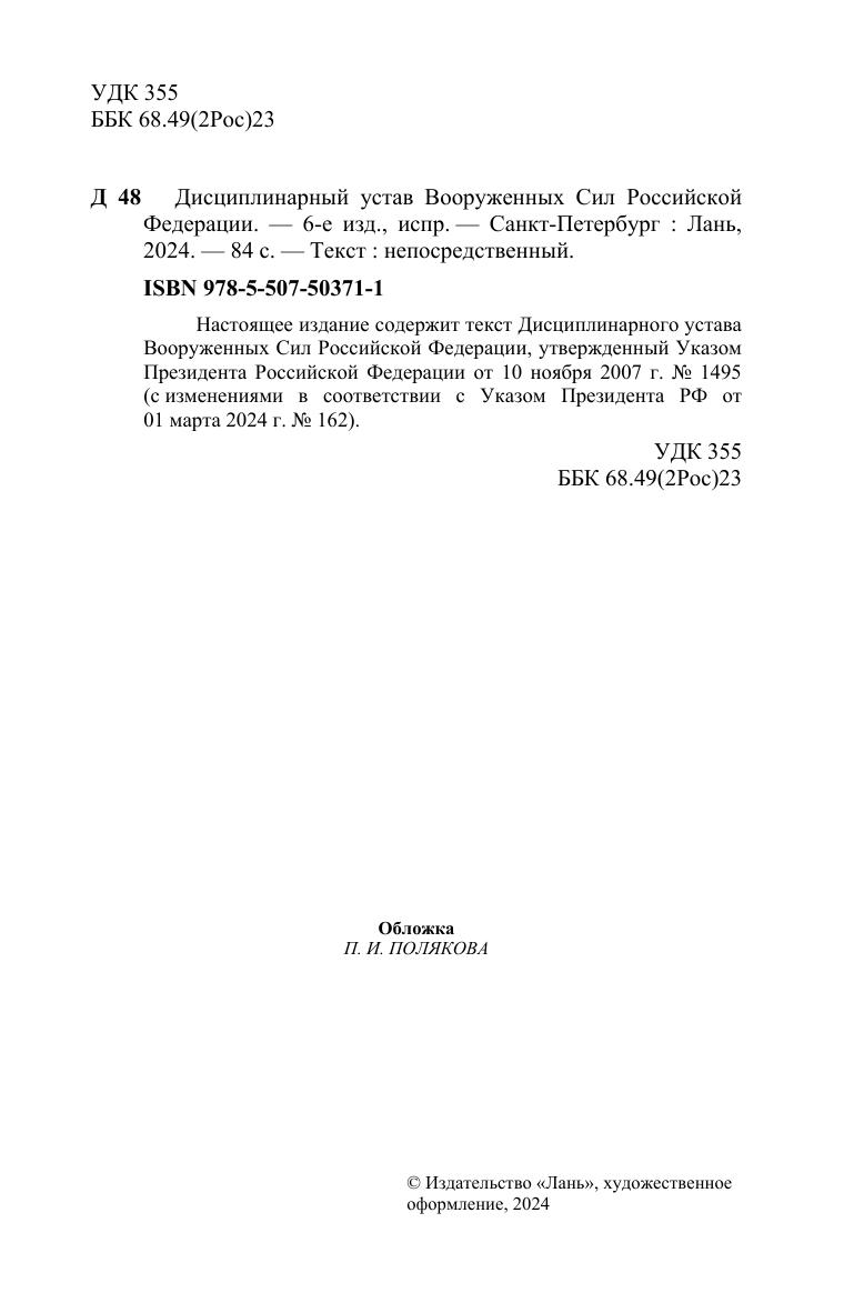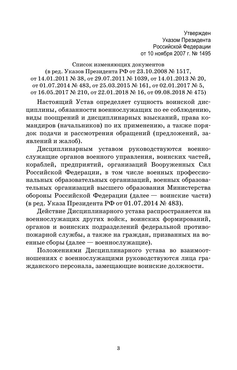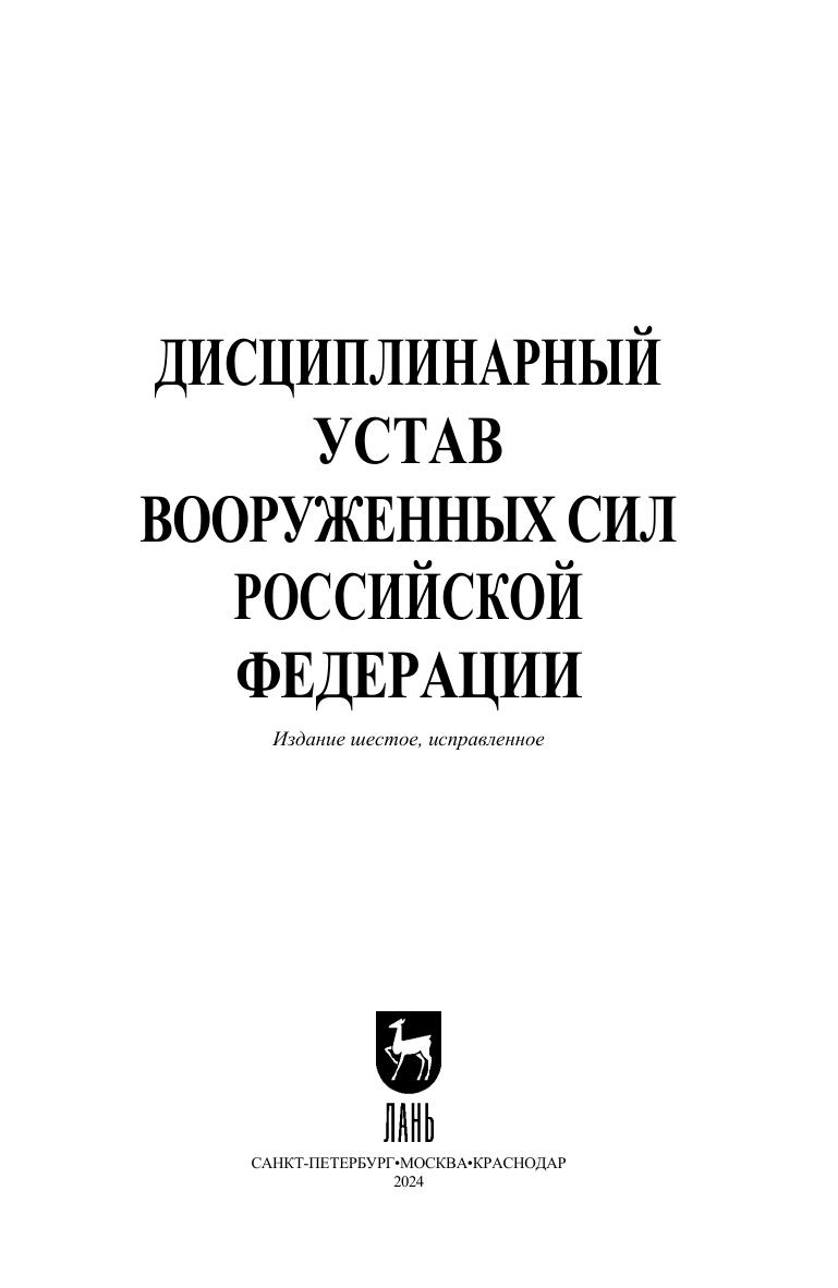 Настоящее издание содержит текст Дисциплинарного устава Вооруженных Сил Российской Федерации, утвержденный Указом Президента Российской Федерации от 10 ноября 2007 г. № 1495 (с изменениями в соответствии с Указом Президента РФ от 01 марта 2024 г. № 162)