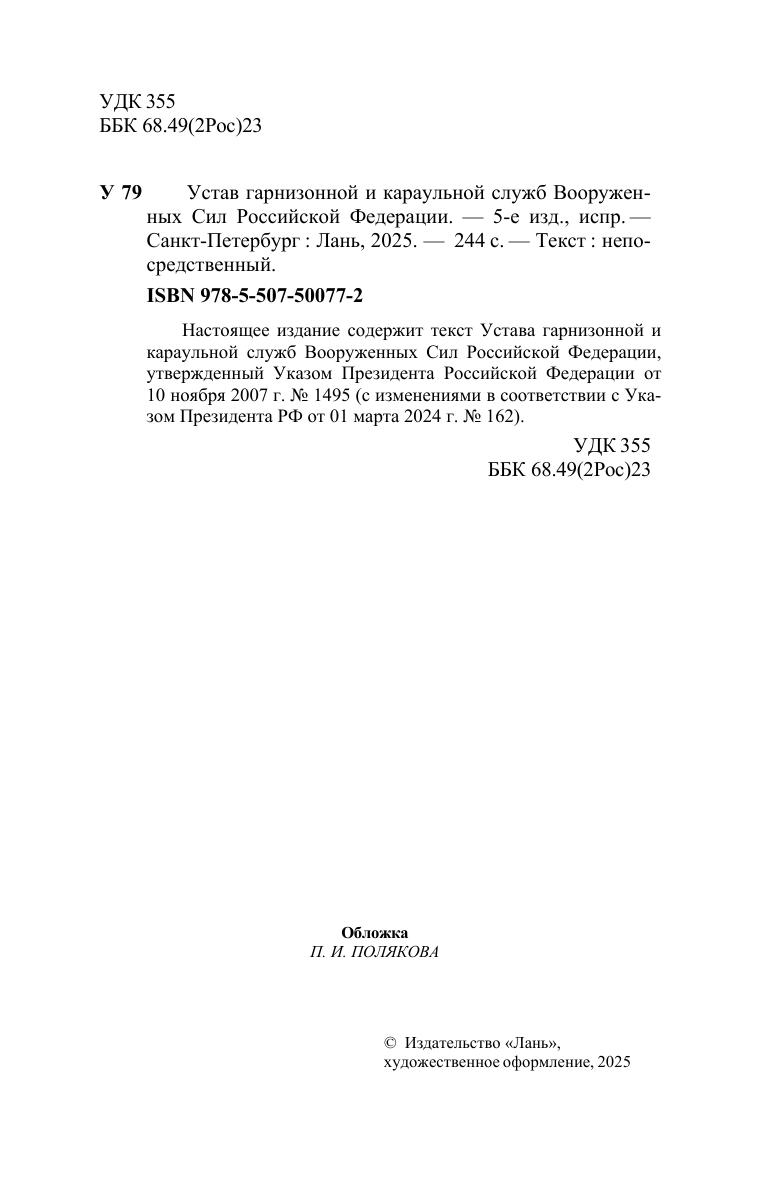 Настоящее издание содержит текст Устава гарнизонной и караульной служб Вооруженных Сил Российской Федерации, утвержденный Указом Президента Российской Федерации от 10 ноября 2007 г. № 1495 (с изменениями в соответствии с Указом Президента РФ от 01 марта 2024 г. № 162).