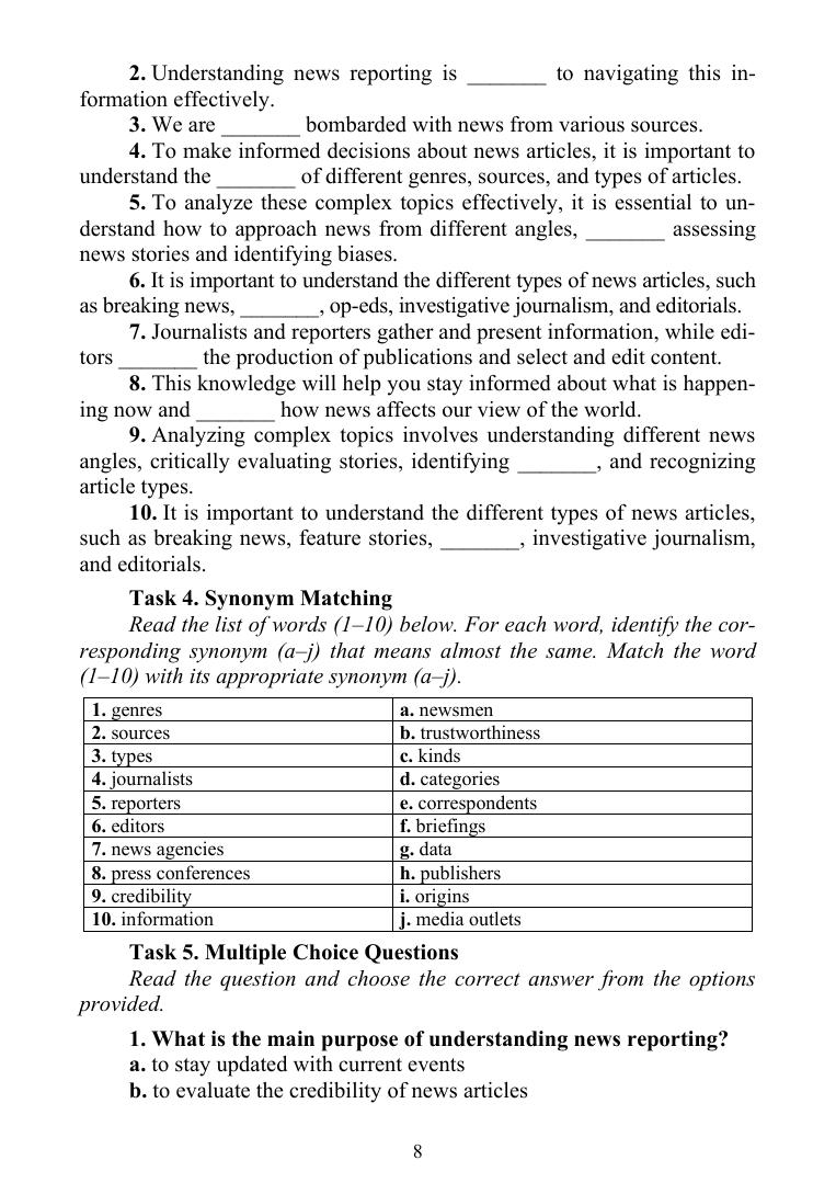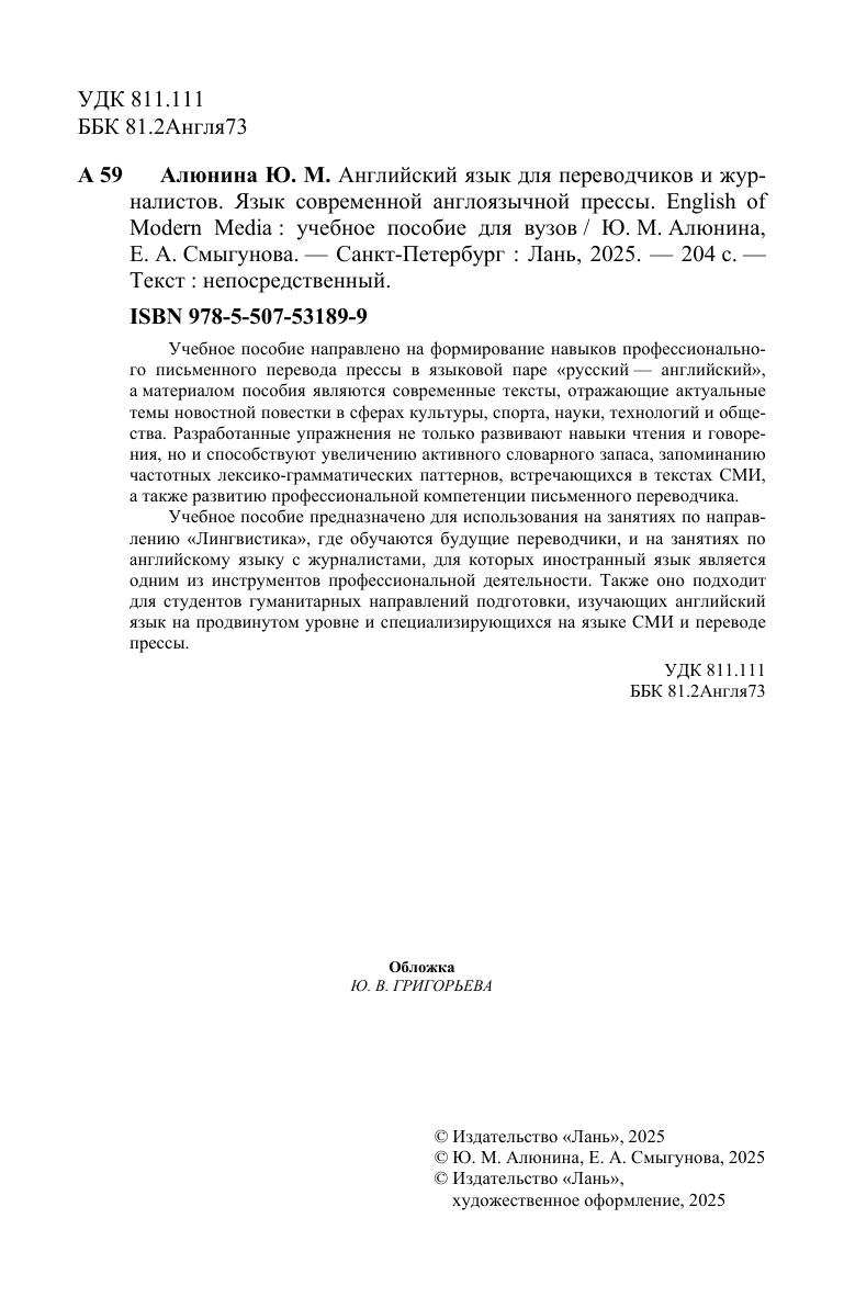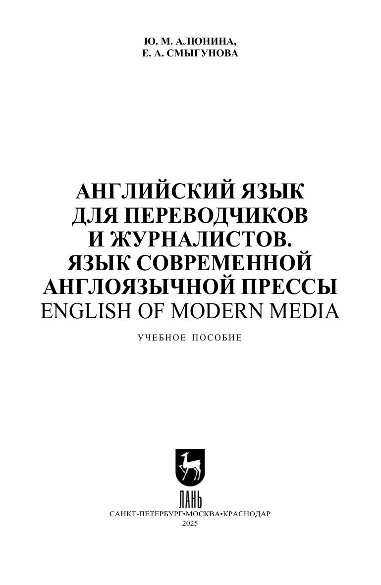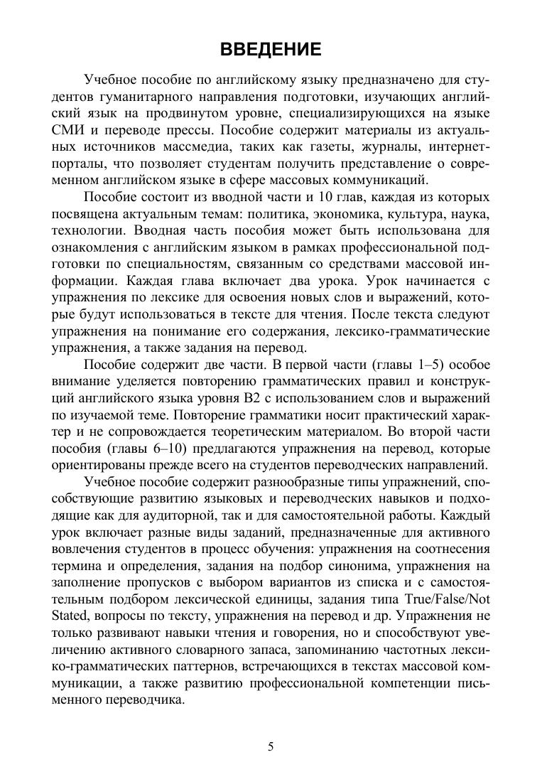 Учебное пособие направлено на формирование навыков профессионального письменного перевода прессы в языковой паре «русский — английский», а материалом пособия являются современные тексты, отражающие актуальные темы новостной повестки в сферах культуры, спорта, науки, технологий и общества. Разработанные упражнения не только развивают навыки чтения и говорения, но и способствуют увеличению активного словарного запаса, запоминанию частотных лексико-грамматических паттернов, встречающихся в текстах СМИ, а также развитию профессиональной компетенции письменного переводчика. Учебное пособие предназначено для использования на занятиях по направлению «Лингвистика», где обучаются будущие переводчики, и на занятиях по английскому языку с журналистами, для которых иностранный язык является одним из инструментов профессиональной деятельности. Также оно подходит для студентов гуманитарных направлений подготовки, изучающих английский язык на продвинутом уровне и специализирующихся на языке СМИ и переводе прессы.
