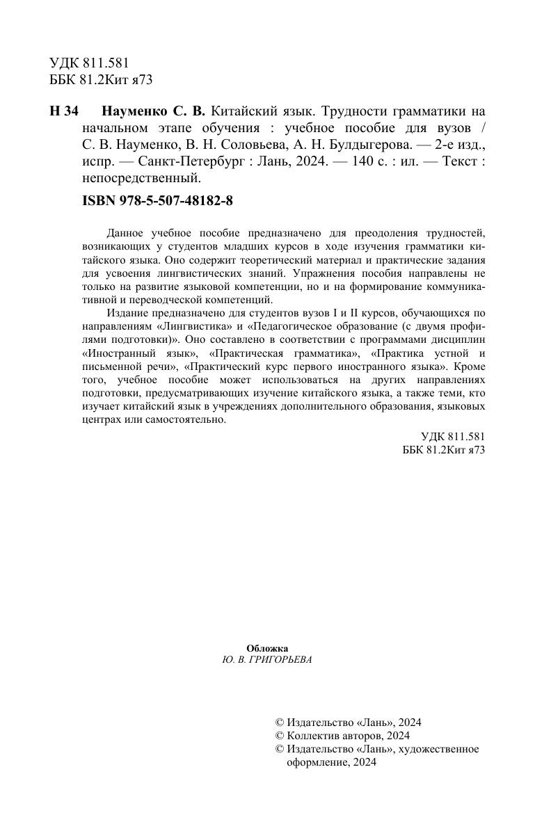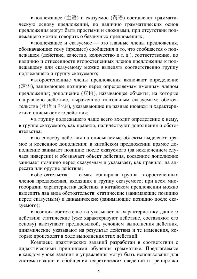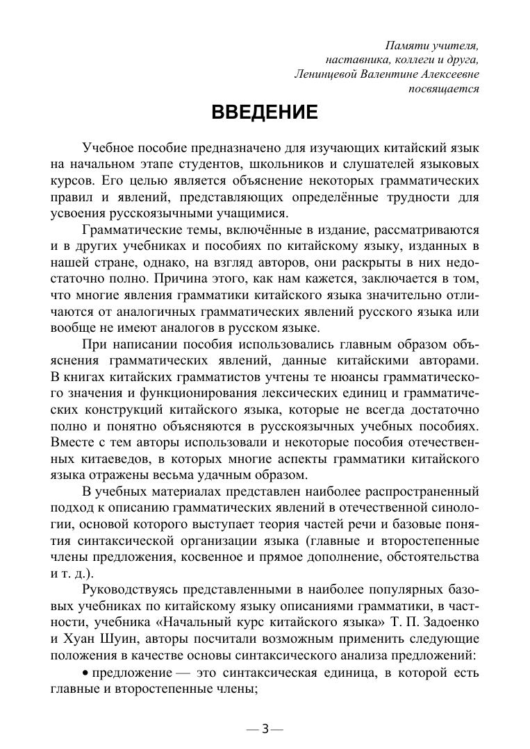 Данное учебное пособие предназначено для преодоления трудностей, возникающих у студентов младших курсов в ходе изучения грамматики китайского языка. Оно содержит теоретический материал и практические задания для усвоения лингвистических знаний. Упражнения пособия направлены не только на развитие языковой компетенции, но и на формирование коммуникативной и переводческой компетенций. Издание предназначено для студентов вузов I и II курсов, обучающихся по направлениям «Лингвистика» и «Педагогическое образование (с двумя профилями подготовки)». Оно составлено в соответствии с программами дисциплин «Иностранный язык», «Практическая грамматика», «Практика устной и письменной речи», «Практический курс первого иностранного языка». Кроме того, учебное пособие может использоваться на других направлениях подготовки, предусматривающих изучение китайского языка, а также теми, кто изучает китайский язык в учреждениях дополнительного образования, языковых центрах или самостоятельно.