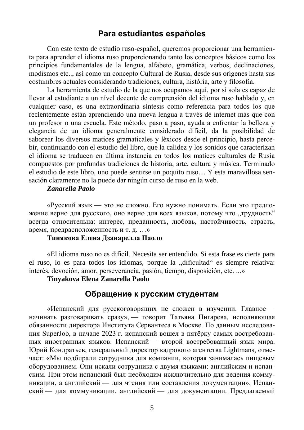 Данный учебник для говорящих на испанском языке является частью проекта «Русский как язык международного общения». Разговорный материал сопровождает интенсивная методика автора, представляющая русский язык всесторонне, без обычных пропусков, встречающихся в других учебниках РКИ (это больше касается фонетики, некоторых деталей морфологии, стилистики и пунктуации). Культурологический блок закладывает основные базовые знания о культуре России. Кроме того, предлагаемый учебник содержит замечательное пространство для овладения устной коммуникацией на испанском языке для российских студентов, изучающих испанский. Причем редакторы испанского текста — яркие носители культуры Испании. Книга предназначается для студентов вузов, прибывших из латиноамериканских испаноязычных стран, а также бизнесменов и специалистов из этих стран, работающих в России. Работа по изучению языка по предлагаемой автором методике поможет им быстрее перейти к профессиональному общению на русском языке.