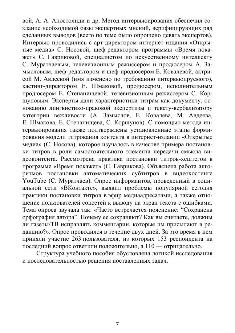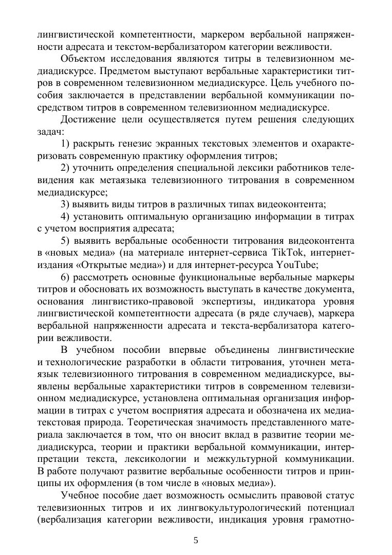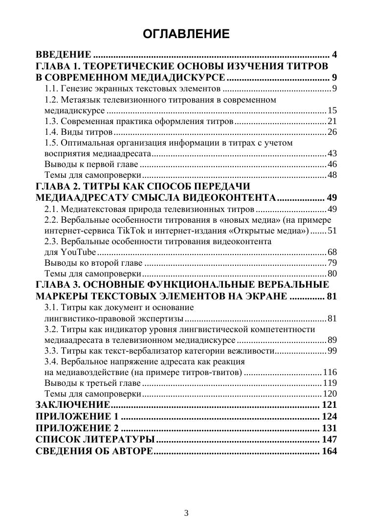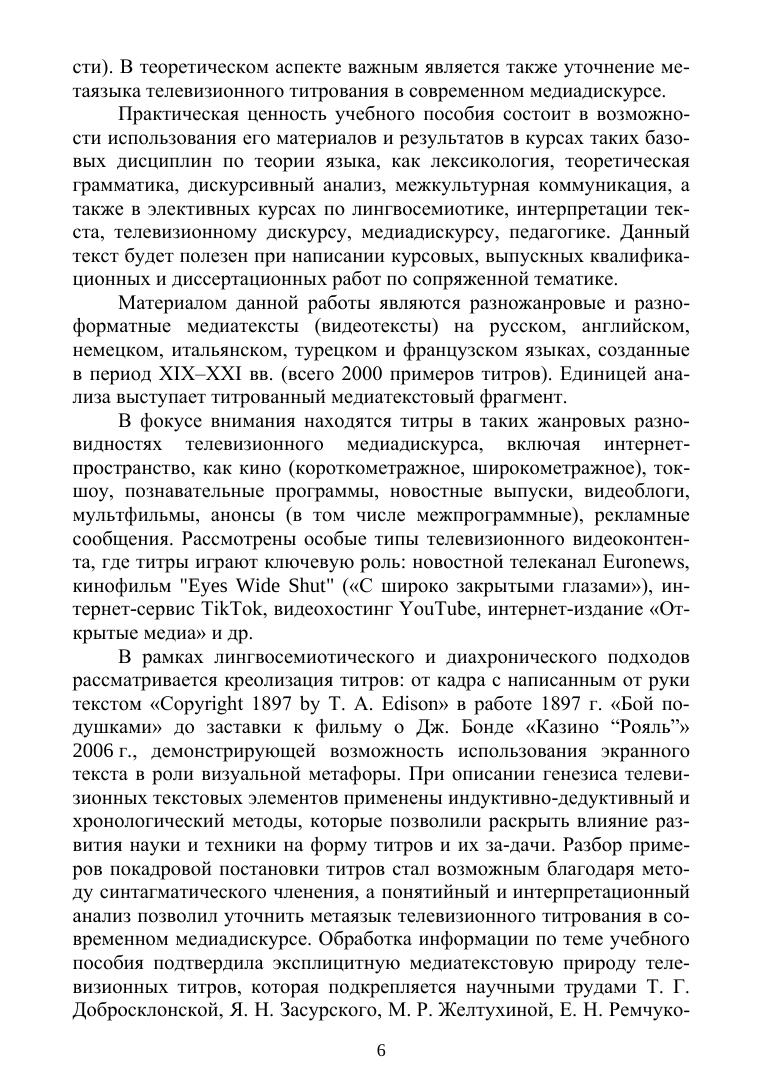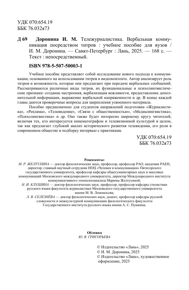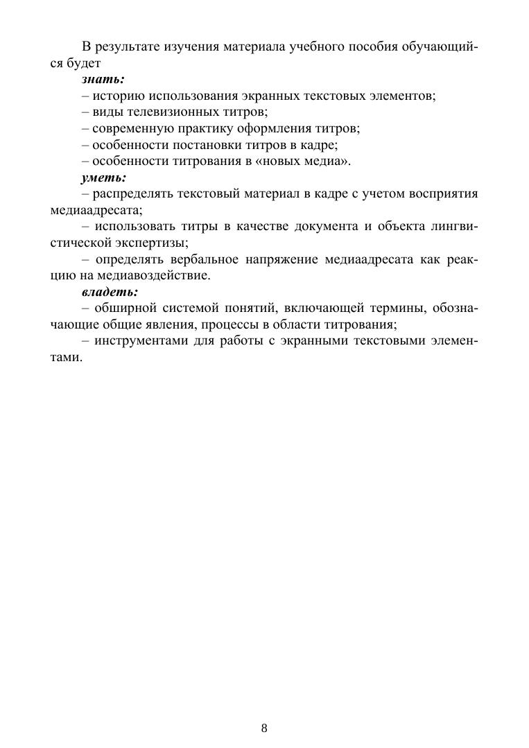 Учебное пособие представляет собой исследование нового подхода к коммуникации, основанного на использовании титров в видеоконтенте. Автор анализирует роль титров и возможности, которые они предлагают при передаче вербальных сообщений. Рассматриваются различные виды титров, их функциональные и психолингвистические признаки: создание настроения, вербализация вежливости, предоставление дополнительной информации, выражение вербальной напряженности и др. В конце каждой главы даются проверочные вопросы для закрепления усвоенного материала. Пособие предназначено для студентов направлений подготовки «Журналистика», «Реклама», «Телевидение», «Связи с общественностью», «Медиалингвистика», «Психолингвистика» и др. Оно также будет интересно широкому кругу читателей, включая тех, кто интересуется кинематографом и телевизионной культурой в целом, так как предлагает глубокий анализ исторического развития телевидения, его роли в современном обществе и подборку интервью с практиками.